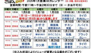 営業時間内でも、売り切れ次第終了します。ご了承ください。営業カレンダーに記載した日替わりメニュー以外にも、・から揚げ定食・チーズハンバーグ定食・オムライスなども数量限定でございます。なお、食材の仕入れ状況により上記のメニューが変わることがご...
